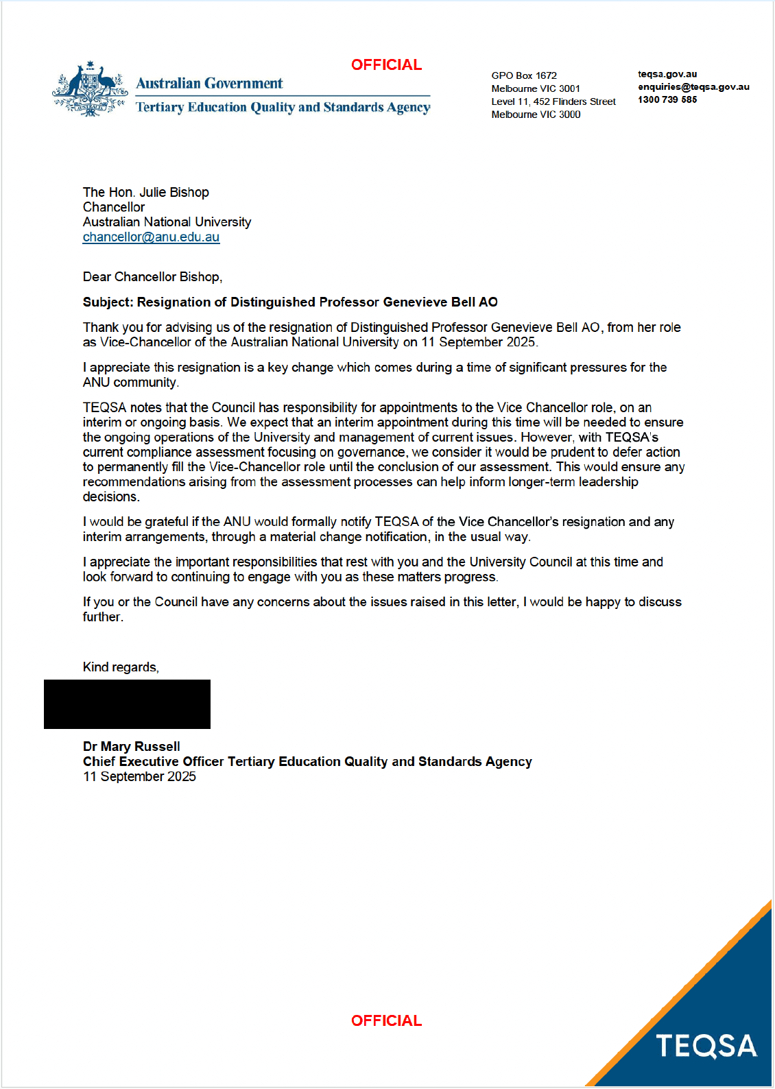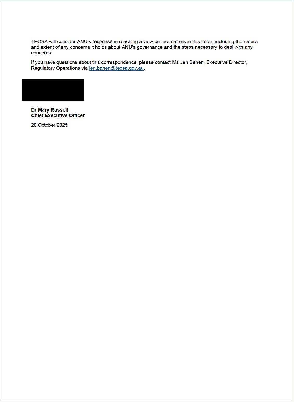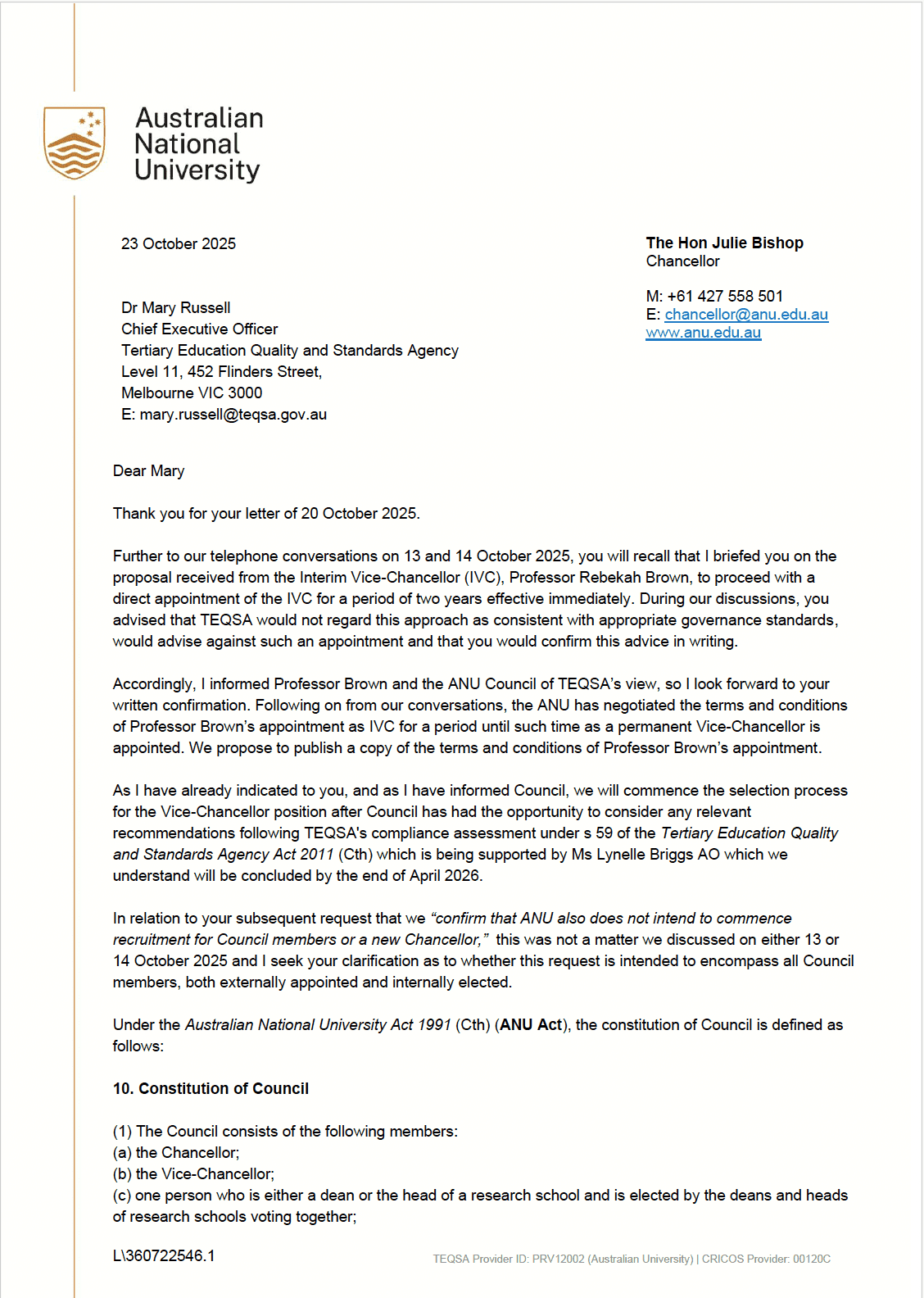 TEQSA provided a copy of Dr Russell’s correspondence with the ANU in answer to a question on notice (and hence while it is not available on the Senate website in the ‘tabled documents’ section – it is available in Answer to Question on Notice: SQ25-000637). There are a lot of questions and answers so to make it easier to read the correspondence – I have included the relevant letters between the ANU Chancellor and TEQSA CEO at the end of this update.