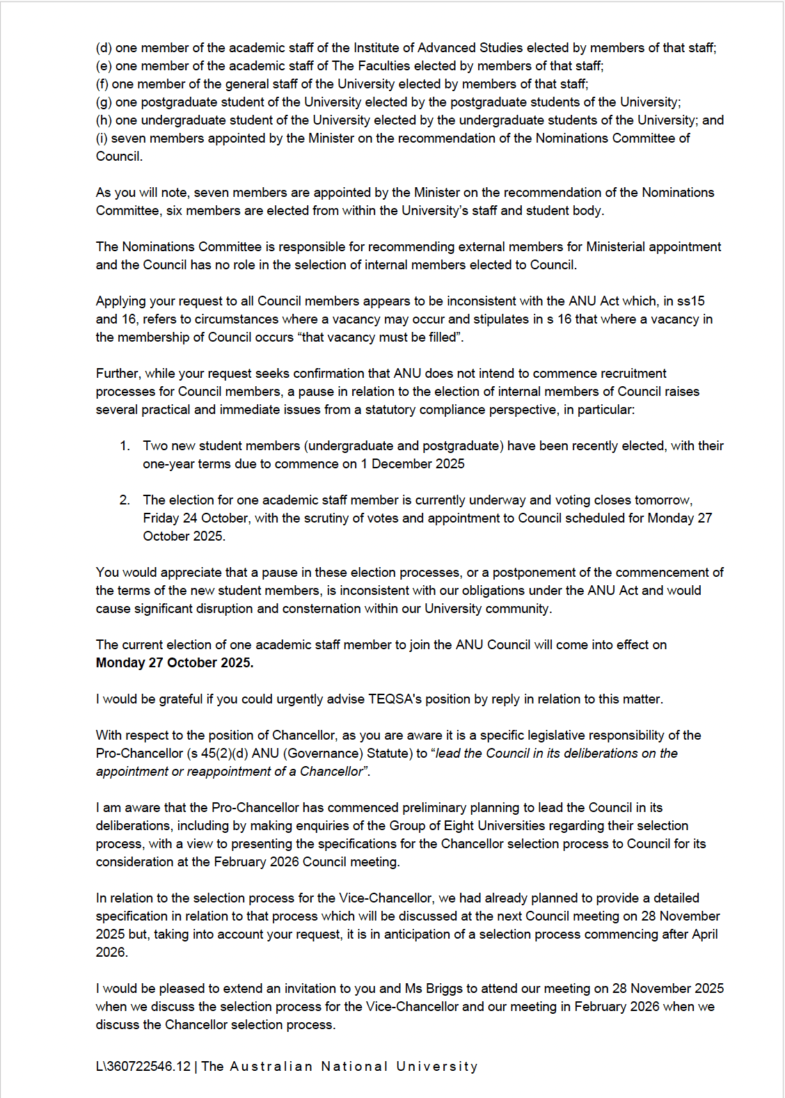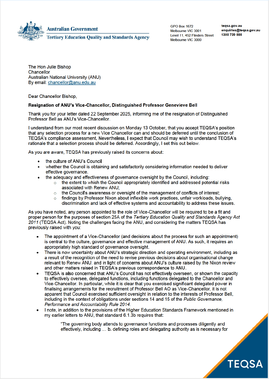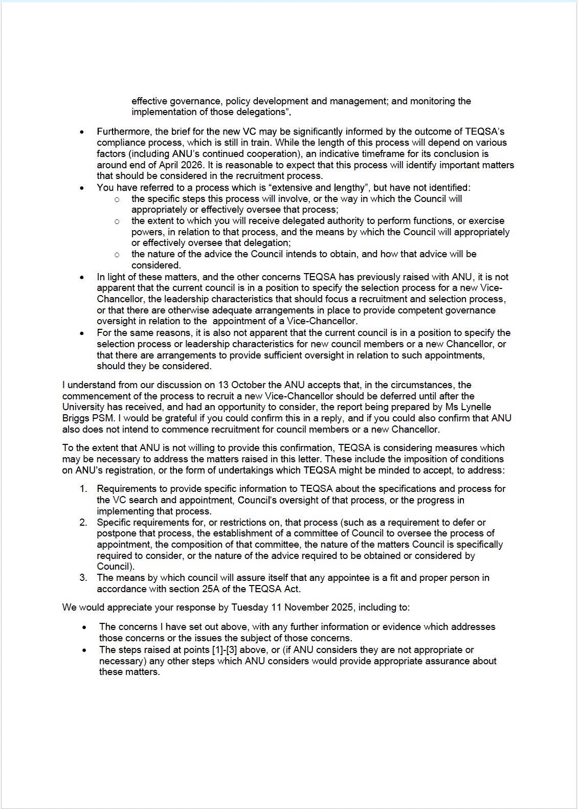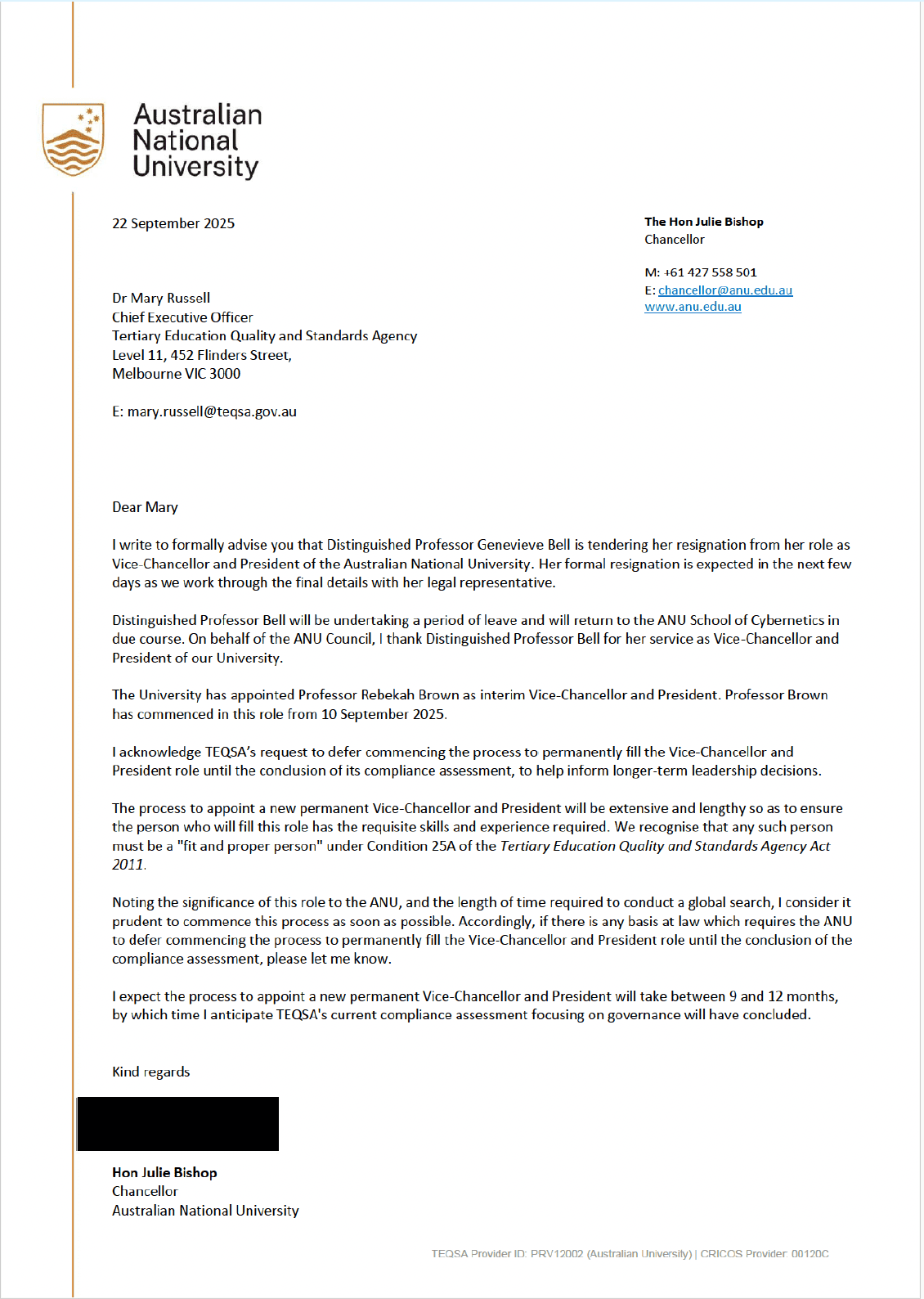 TEQSA provided a copy of Dr Russell’s correspondence with the ANU in answer to a question on notice (and hence while it is not available on the Senate website in the ‘tabled documents’ section – it is available in Answer to Question on Notice: SQ25-000637). There are a lot of questions and answers so to make it easier to read the correspondence – I have included the relevant letters between the ANU Chancellor and TEQSA CEO at the end of this update.