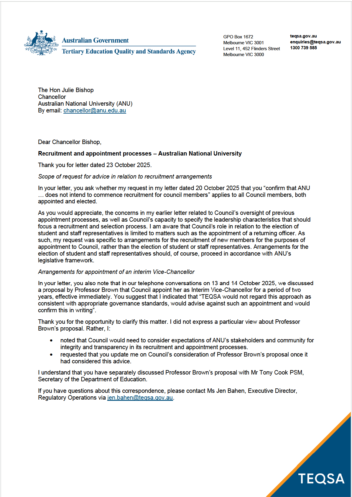 A tale of two regulators… (update 14 December 2025 re: correspondence between TEQSA and the ANU)