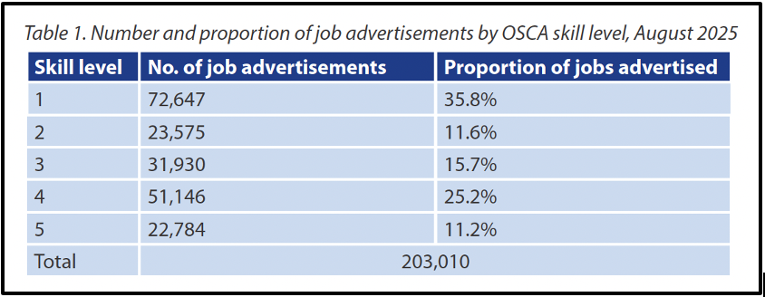 The report starts by analysing the skill levels of the 203,010 jobs advertised on the Internet Vacancy Index (IVI) in August 2025 (ie how many jobs were advertised online that month):