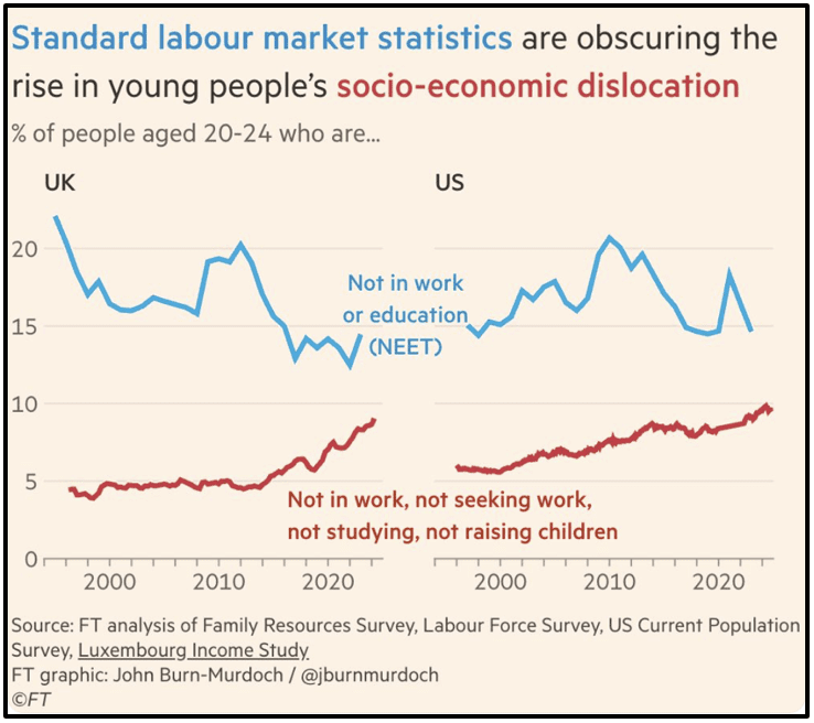 John Burn-Murdoch’s recent Financial Times analysis (shared on Bluesky last week) highlights an increasingly hidden challenge: while headline rates for people who are not in education or employment (NEET) are stable or improving in the UK and US, the subgroup of young adults who are not working, not studying, not seeking work, and not parenting has doubled in a decade in both countries. This group of young people are experiencing deep social and economic disengagement.